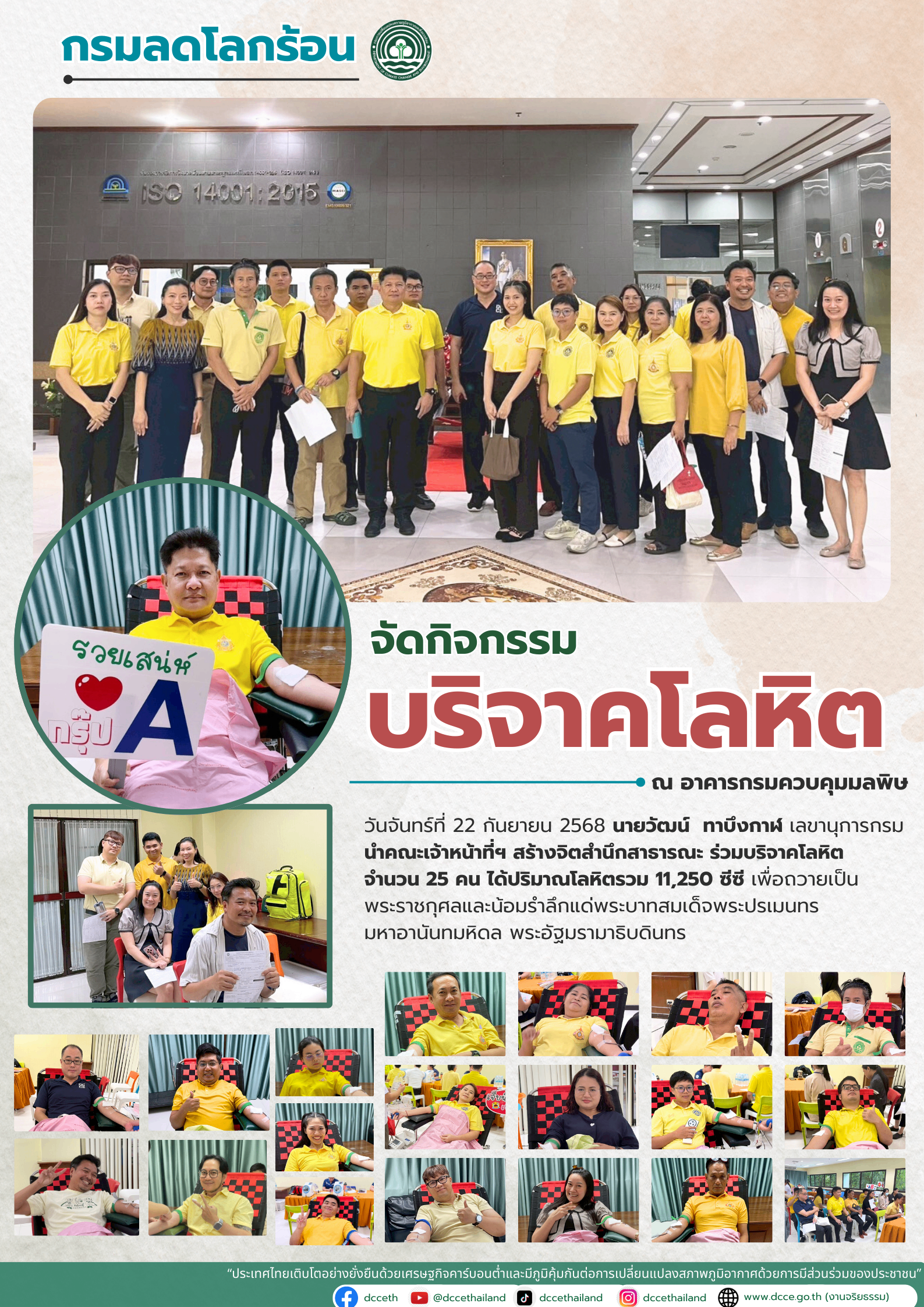 วันจันทร์ที่ 22 กันยายน 2568 นายวัฒน์ ทาบึงกาฬ เลขานุการกรมนำคณะเจ้าหน้าที่ฯ สร้างจิตสำนึกสาธารณะ ร่วมบริจาคโลหิตจำนวน 25 คน ได้ปริมาณโลหิตรวม 11,250 ซีซี เพื่อถวายเป็นพระราชกุศลและน้อมรำลึกแด่พระบาทสมเด็จพระปรเมนทรมหาอานันทมหิดล พระอัฐมรามาธิบดินทร