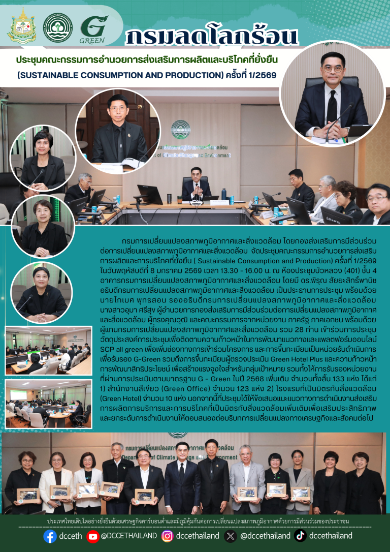 กรมการเปลี่ยนแปลงสภาพภูมิอากาศและสิ่งแวดล้อม โดยกองส่งเสริมการมีส่วนร่วมต่อการเปลี่ยนแปลงสภาพภูมิอากาศและสิ่งแวดล้อม จัดประชุมคณะกรรมการอำนวยการส่งเสริมการผลิตและการบริโภคที่ยั่งยืน ( Sustainable Consumption and Production) ครั้งที่ 1/2569 ในวันพฤหัสบดีที่ 8 มกราคม 2569 เวลา 13.30 – 16.00 น. ณ ห้องประชุมบัวหลวง (401) ชั้น 4 อาคารกรมการเปลี่ยนแปลงสภาพภูมิอากาศและสิ่งแวดล้อม โดยมี ดร.พิรุณ สัยยะสิทธิ์พานิช อธิบดีกรมการเปลี่ยนแปลงสภาพภูมิอากาศและสิ่งแวดล้อม เป็นประธานการประชุม พร้อมด้วย นายโกเมศ พุทธสอน รองอธิบดีกรมการเปลี่ยนแปลงสภาพภูมิอากาศและสิ่งแวดล้อม นางสาวอุมา ศรีสุข ผู้อำนวยการกองส่งเสริมการมีส่วนร่วมต่อการเปลี่ยนแปลงสภาพภูมิอากาศ และสิ่งแวดล้อม ผู้ทรงคุณวุฒิ และคณะกรรมการจากหน่วยงาน ภาครัฐ ภาคเอกชน พร้อมด้วย ผู้แทนกรมการเปลี่ยนแปลงสภาพภูมิอากาศและสิ่งแวดล้อม รวม 28 ท่าน เข้าร่วมการประชุมวัตถุประสงค์การประชุมเพื่อติดตามความก้าวหน้าในการพัฒนาแนวทางและแพลตฟอร์มออนไลน์ SCP all green เพื่อเพิ่มช่องทางการเข้าร่วมโครงการ และการขึ้นทะเบียนเป็นหน่วยรับดำเนินการเพื่อรับรอง G-Green รวมถึงการขึ้นทะเบียนผู้ตรวจประเมิน Green Hotel Plus และความก้าวหน้า การพัฒนาสิทธิประโยชน์ เพื่อสร้างแรงจูงใจสำหรับกลุ่มเป้าหมาย รวมทั้งให้การรับรองหน่วยงาน ที่ผ่านการประเมินตามมาตรฐาน G – Green ในปี 2568 เพิ่มเติม จำนวนทั้งสิ้น 133 แห่ง ได้แก่ 1) สำนักงานสีเขียว (Green Office) จำนวน 123 แห่ง 2) โรงแรมที่เป็นมิตรกับสิ่งแวดล้อม (Green Hotel) จำนวน 10 แห่ง นอกจากนี้ที่ประชุมได้ให้ข้อเสนอแนะแนวทางการดำเนินงานส่งเสริมการผลิตการบริการและการบริโภคที่เป็นมิตรกับสิ่งแวดล้อมเพิ่มเติมเพื่อเสริมประสิทธิภาพ และยกระดับการดำเนินงานให้ตอบสนองต่อบริบทการเปลี่ยนแปลงทางเศรษฐกิจและสังคมต่อไป #DCCE