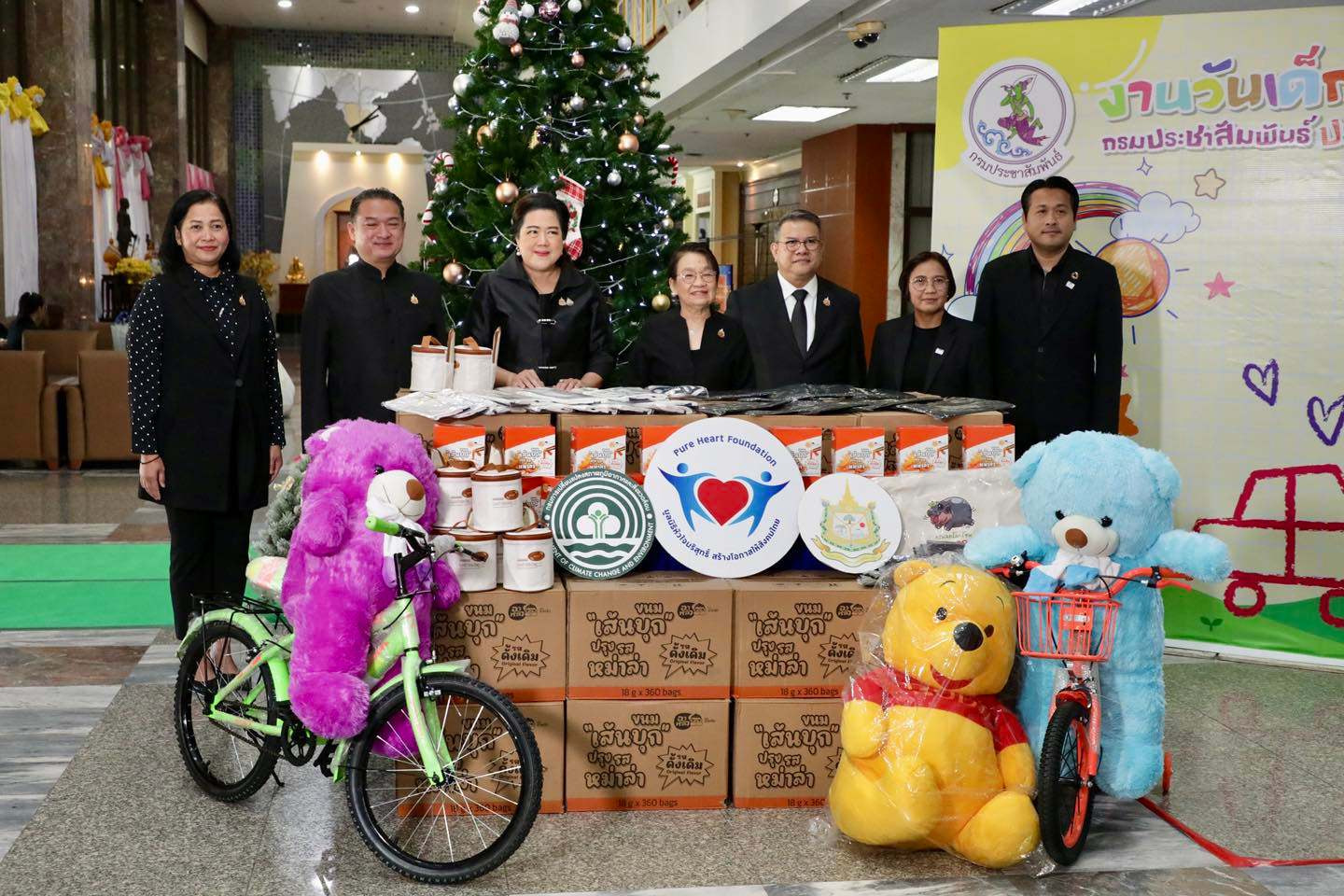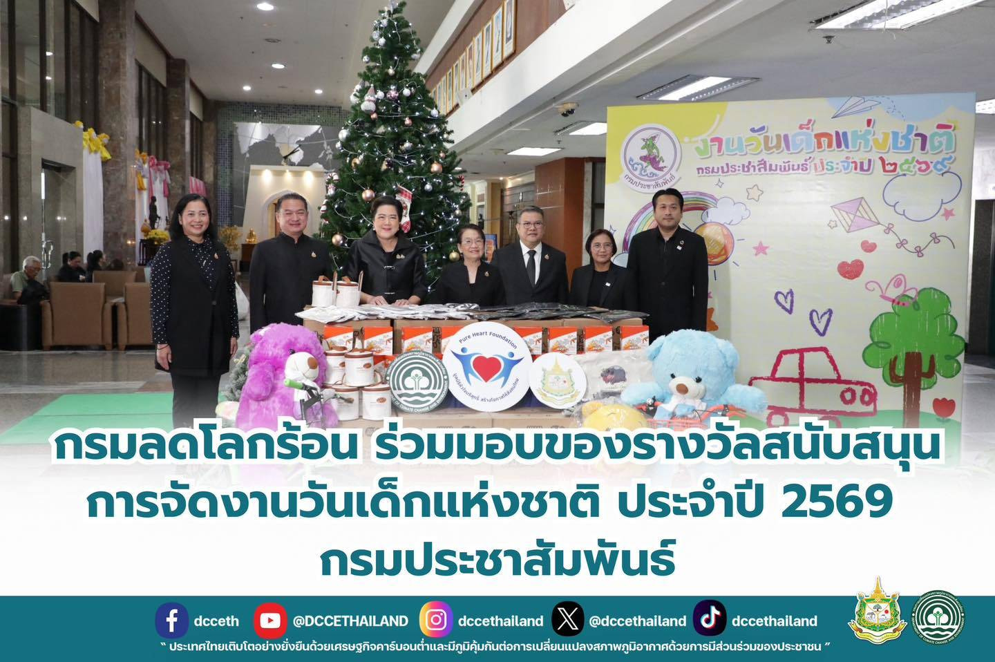 วันพฤหัสบดีที่ 8 มกราคม 2569 นายปวิช เกศววงศ์ รองอธิบดีกรมการเปลี่ยนแปลงสภาพภูมิอากาศและสิ่งแวดล้อม ร่วมมอบของรางวัลสนับสนุนการจัดงาน วันเด็กแห่งชาติประจำปี 2569 ให้กับ นางสุดหทัย เลิศเกษม อธิบดีกรมประชาสัมพันธ์ เพื่อแจกในงานวันเด็กแห่งชาติ ประจำปี 2569 ณ กรมประชาสัมพันธ์ ทั้งนี้ กระทรวงทรัพยากรธรรมชาติและสิ่งแวดล้อม โดยกรมการเปลี่ยนแปลงสภาพภูมิอากาศและสิ่งแวดล้อมร่วมกับสำนักเลขาธิการนายกรัฐมนตรี จัดกิจกรรมส่งเสริมการเรียนรู้เรื่องทรัพยากรธรรมชาติและสิ่งแวดล้อมและบทบาทหน้าที่ของเด็กและเยาวชนกับการมีส่วนร่วมในการจัดการสิ่งแวดล้อมที่ดีและสร้างความตระหนักรู้ในบทบาทหน้าที่ของเด็กและเยาวชนไทยต่อความรับผิดชอบร่วมในสถานการณ์สิ่งแวดล้อมและการเปลี่ยนแปลงสภาพภูมิอากาศที่เกิดขึ้นในปัจจุบัน โดยปีนี้ รักษาการนายกรัฐมนตรี (นายอนุทิน ชาญวีรกูล) ได้มอบคำขวัญเนื่องในวันเด็กแห่งชาติ ประจำปีพุทธศักราช 2569 ว่า “รักชาติไทย ใส่ใจโลก” เพื่อปลูกฝังให้เด็กและเยาวชนไทยเติบโตเป็นพลเมืองที่มีคุณภาพ มีความรักและความภาคภูมิใจในชาติ ควบคู่กับการตระหนักถึงความรับผิดชอบต่อสิ่งแวดล้อม สังคม และประชาคมโลก โดยกระทรวงฯ ได้เตรียมการจัดกิจกรรมเนื่องในวันเด็กแห่งชาติ ประจำปี 2569 ณ ทำเนียบรัฐบาล ภายใต้แนวคิด “สนุก เปลี่ยนโลก” ซึ่งจะมีการแบ่งโซนกิจกรรมการเรียนรู้ พร้อมด้วยกิจกรรมไฮไลท์ถ่ายภาพกับกองทัพไดโนเสาร์ ขบวนพาเหรดมาสคอต รักชาติไทย ใส่ใจโลก และกิจกรรมร่วมสนุกบนเวทีกลางรับของรางวัลมากมาย