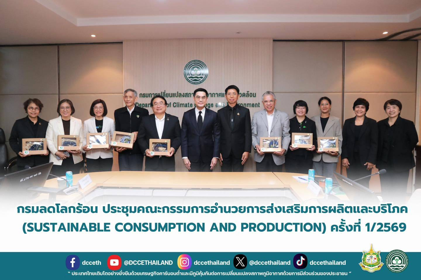 กรมการเปลี่ยนแปลงสภาพภูมิอากาศและสิ่งแวดล้องแวดล้อม โดยกองส่งเสริมการมีส่วนร่วมต่อการเปลี่ยนแปลงสภาพภูมิอากาศและสิ่งแวดล้อม จัดประชุมคณะกรรมการอำนวยการส่งเสริมการผลิตและการบริโภคที่ยั่งยืน ( Sustainable Consumption and Production) ครั้งที่ 1/2569 เมื่อวันพฤหัสบดีที่ 8 มกราคม 2569 เวลา 13.30 – 16.00 น. ณ ห้องประชุมบัวหลวง (401) ชั้น 4 อาคารกรมการเปลี่ยนแปลงสภาพภูมิอากาศและสิ่งแวดล้อม โดยมี ดร.พิรุณ สัยยะสิทธิ์พานิช อธิบดีกรมการเปลี่ยนแปลงสภาพภูมิอากาศและสิ่งแวดล้อมแวดล้อม เป็นประธาน พร้อมด้วย นายโกเมศ พุทธสอน รองอธิบดีกรมการเปลี่ยนแปลงสภาพภูมิอากาศและสิ่งแวดล้อม นางสาวอุมา ศรีสุข ผู้อำนวยการกองส่งเสริมการมีส่วนร่วมต่อการเปลี่ยนแปลงสภาพภูมิอากาศและสิ่งแวดล้อม ผู้ทรงคุณวุฒิ และคณะกรรมการจากหน่วยงาน ภาครัฐ ภาคเอกชน พร้อมด้วยผู้แทนกรม รวม 28 ท่าน การประชุมครั้งนี้มีวัตถุประสงค์เพื่อติดตามความก้าวหน้าในการพัฒนาแนวทางและแพลตฟอร์มออนไลน์ SCP all green ซึ่งเป็นการเพิ่มช่องทางการเข้าร่วมโครงการ และการขึ้นทะเบียนเป็นหน่วยรับดำเนินการเพื่อรับรอง G-Green รวมถึงการขึ้นทะเบียนผู้ตรวจประเมิน Green Hotel Plus และความก้าวหน้าการพัฒนาสิทธิประโยชน์ เพื่อสร้างแรงจูงใจสำหรับกลุ่มเป้าหมาย รวมทั้งให้การรับรองหน่วยงานที่ผ่านการประเมินตามมาตรฐาน G – Green ในปี 2568 เพิ่มเติม จำนวนทั้งสิ้น 133 แห่ง ได้แก่ 1) สำนักงานสีเขียว (Green Office) จำนวน 123 แห่ง 2) โรงแรมที่เป็นมิตรกับสิ่งแวดล้อม (Green Hotel) จำนวน 10 แห่ง นอกจากนี้ที่ประชุมได้ให้ข้อเสนอแนะแนวทางการดำเนินงานส่งเสริมการผลิตการบริการและการบริโภคที่เป็นมิตรกับสิ่งแวดล้อมเพิ่มเติม เพื่อเสริมประสิทธิภาพและยกระดับการดำเนินงานให้ตอบสนองต่อบริบทการเปลี่ยนแปลงทางเศรษฐกิจและสังคมต่อไป