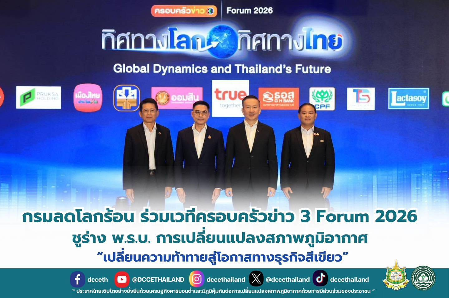กรมลดโลกร้อน ร่วมเวทีครอบครัวข่าว 3 Forum 2026 ชูร่าง พ.ร.บ. การเปลี่ยนแปลงสภาพภูมิอากาศ “เปลี่ยนความท้าทายสู่โอกาสทางธุรกิจสีเขียว”