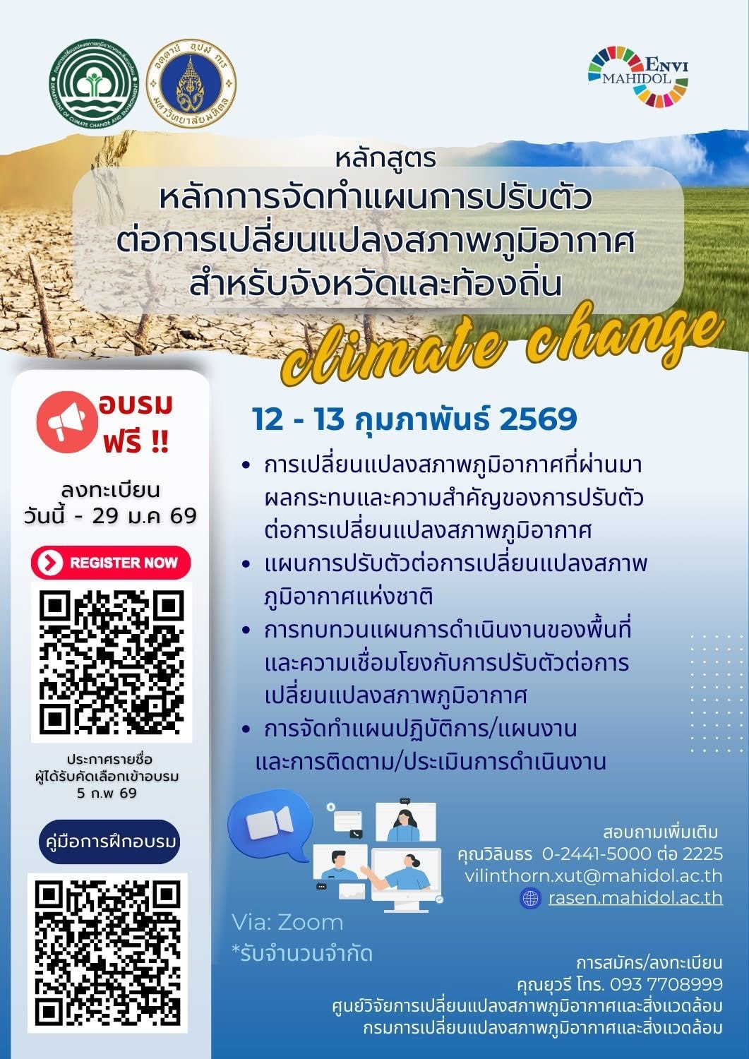 ขอเชิญร่วมอบรมหลักสูตรออนไลน์ “หลักการจัดทำแผนการปรับตัวต่อการเปลี่ยนแปลงสภาพภูมิอากาศสำหรับจังหวัดและท้องถิ่น”