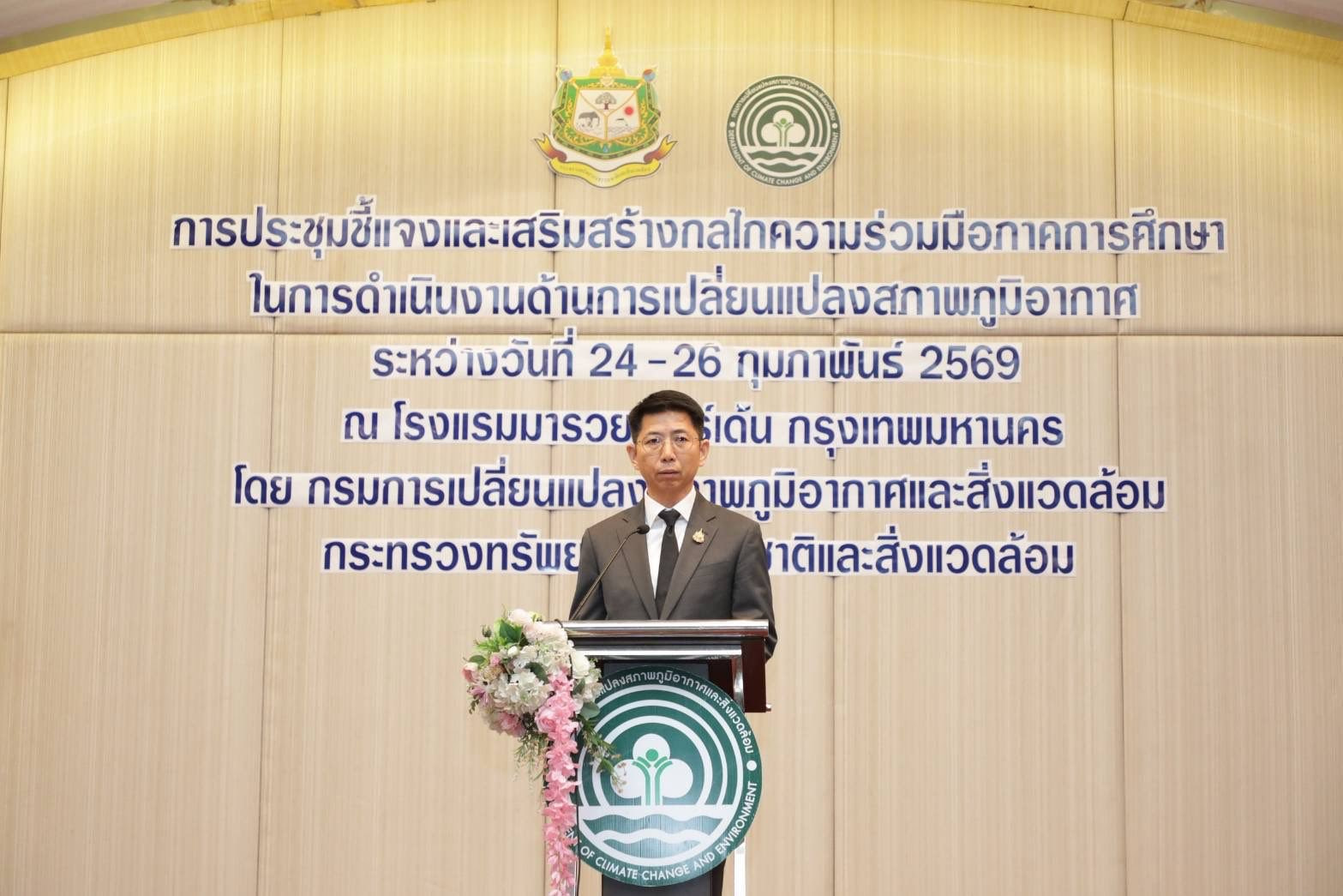 เมื่อวันที่ 25 กุมภาพันธ์ 2569 นายโกเมศ พุทธสอน รองอธิบดีกรมการเปลี่ยนแปลงสภาพภูมิอากาศและสิ่งแวดล้อม เป็นประธานในพิธีเปิดการประชุมชี้แจงและเสริมสร้างกลไกความร่วมมือภาคการศึกษาในการดำเนินงาน ด้านการเปลี่ยนแปลงสภาพภูมิอากาศ ซึ่งมีนางสาวอุมา ศรีสุข ผู้อำนวยการกองส่งเสริมการมีส่วนร่วมต่อการเปลี่ยนแปลงสภาพภูมิอากาศและสิ่งแวดล้อมเป็นผู้กล่าวรายงาน และมี รศ.ดร.แสงดาว วงค์สาย อาจารย์ประจำคณะวิทยาศาสตร์และเทคโนโลยี มหาวิทยาลัยธรรมศาสตร์ เป็นวิทยากรกระบวนการ พร้อมทั้งมีผู้เข้าร่วม ประกอบด้วย ผู้ช่วยอธิการบดี คณบดี รองคณบดี ศึกษานิเทศก์ อาจารย์ นักวิจัย และผู้แทนจากมหาวิทยาลัย จำนวน 105 คน โดยจัดระหว่างวันที่ 24 – 26 กุมภาพันธ์ 2569 ณ ห้องประชุม Ballroom A ชั้น 2 โรงแรมมารวย การ์เด้น กรุงเทพมหานคร