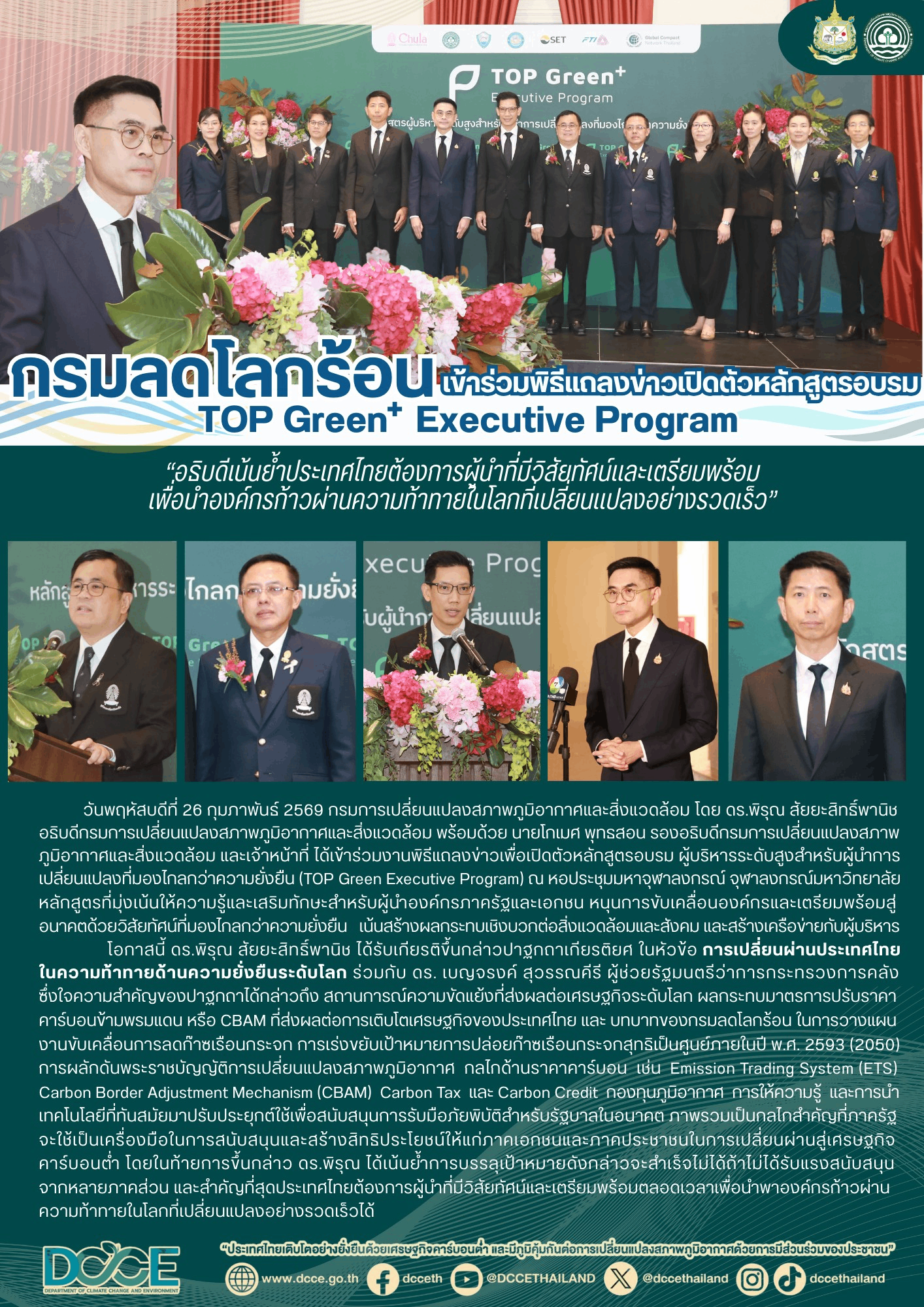 กรมลดโลกร้อนเข้าร่วมพิธีแถลงข่าวเปิดตัวหลักสูตรอบรม TOP Green+ Executive Program “อธิบดีเน้นย้ำประเทศไทยต้องการผู้นำที่มีวิสัยทัศน์และเตรียมพร้อมเพื่อนำองค์กรก้าวผ่านความท้าทายในโลกที่เปลี่ยนแปลงอย่างรวดเร็ว”