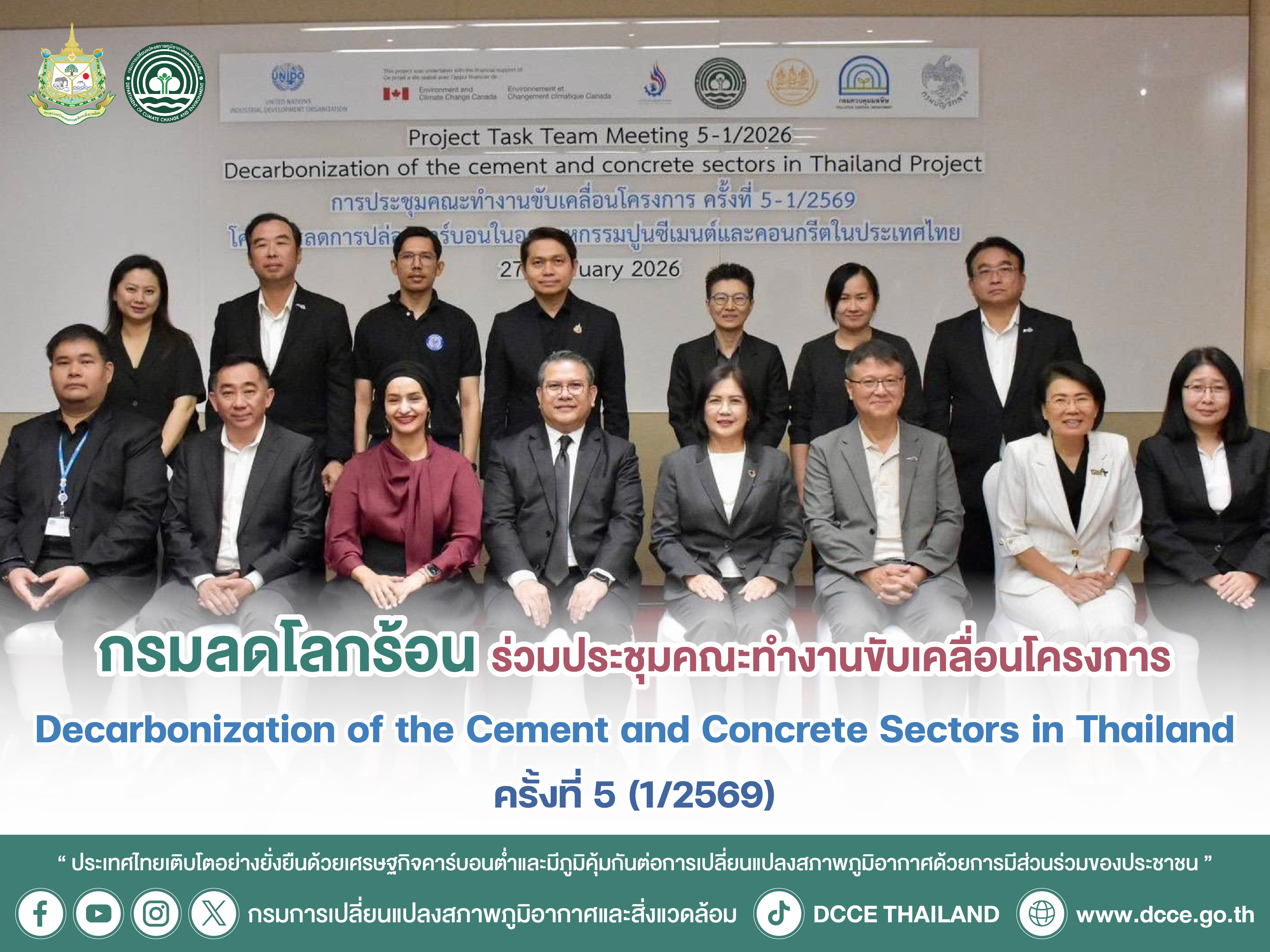 เมื่อวันที่ 27 กุมภาพันธ์ 2569 กรมการเปลี่ยนแปลงสภาพภูมิอากาศและสิ่งแวดล้อม โดย นายปวิช เกศววงศ์ รองอธิบดีกรมการเปลี่ยนแปลงสภาพภูมิอากาศและสิ่งแวดล้อม เป็นประธานการประชุม ร่วมกับนางสาวอารยา ไสลเพชร รองอธิบดีกรมโรงงานอุตสาหกรรม และ Ms. Lauren Dodds Deputy Director, Environment and Climate Change Canada พร้อมด้วย นายศิวัช แก้วเจริญ ผู้อำนวยการกองขับเคลื่อนการลดก๊าซเรือนกระจก เจ้าหน้าที่ สส. และคณะทำงานฯ ได้แก่ สำนักงานสภาพัฒนาการเศรษฐกิจและสังคมแห่งชาติ กรมควบคุมมลพิษ กรมบัญชีกลาง และภาคเอกชน ได้แก่ สภาอุตสาหกรรมแห่งประเทศไทย สมาคมอุตสาหกรรมปูนซีเมนต์ไทย (TCMA) สมาคมอุตสาหกรรมก่อสร้างไทย ในพระบรมราชูปถัมภ์ (TCA) โดยทางองค์การพัฒนาอุตสาหกรรมแห่งสหประชาชาติ (UNIDO) เป็นฝ่ายเลขานุการโครงการ