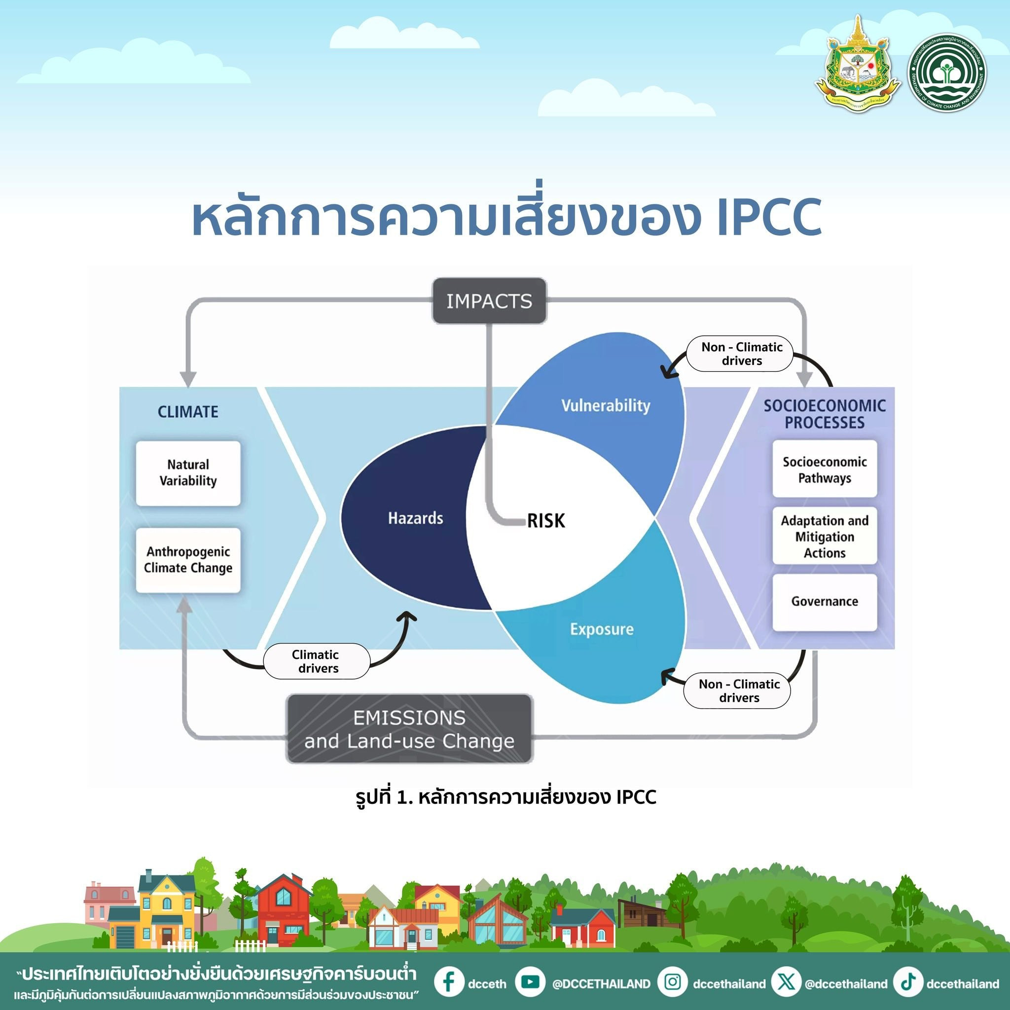กรอบแนวคิดนี้จะช่วยให้การวิเคราะห์ความเสี่ยง สะท้อนทั้งลักษณะของภัยอันตราย กลุ่มที่ได้รับผลกระทบ ความอ่อนไหวของกลุ่มที่ได้รับผลกระทบ และความสามารถในการปรับตัว ซึ่งเป็นพื้นฐานสำคัญสำหรับการวางแผนการปรับตัวอย่างมีประสิทธิภาพ (รูปที่ 1. หลักการความเสี่ยงของ IPCC)