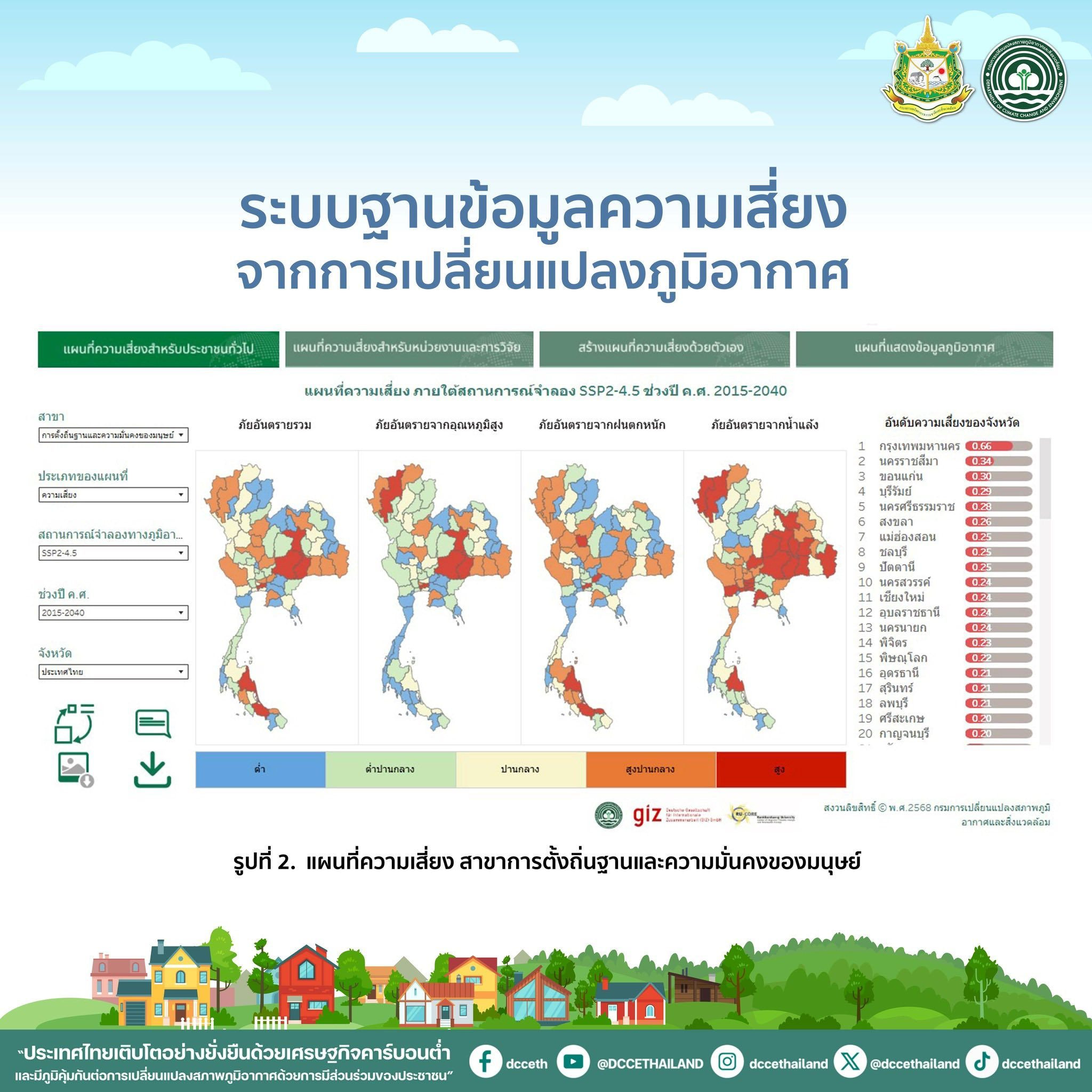 ตัวอย่างการแสดงข้อมูลแผนที่ความเสี่ยง สาขาการตั้งถิ่นฐานและความมั่นคงของมนุษย์ (รูปที่ 2) ภายใต้ฉากทัศน์ SSP2-4.5 ช่วงเวลา ค.ศ. 2015–2040 พบว่า กรุงเทพมหานคร นครราชสีมา ขอนแก่น บุรีรัมย์ และนครศรีธรรมราช เป็นพื้นที่ที่มีระดับความเสี่ยงสูง 5 อันดับแรก สะท้อนให้เห็นถึงความท้าทายของเมืองขนาดใหญ่ที่มีความหนาแน่นของประชากรและกิจกรรมทางเศรษฐกิจสูง ซึ่งมีแนวโน้มที่จะได้รับผลกระทบจากภัยต่างๆ ทั้ง อุณหภูมิสูง ฝนตกหนัก และน้ำแล้ง เพิ่มขึ้น นำไปสู่การกำหนดนโยบาย แผน และมาตรการปรับตัวต่อการเปลี่ยนแปลงสภาพภูมิอากาศในพื้นที่ดังกล่าว เช่น การเพิ่มพื้นที่สีเขียว การพัฒนาโครงสร้างพื้นฐานเพื่อรองรับน้ำท่วมและอากาศร้อน เป็นต้น (รูปที่ 2. แผนที่ความเสี่ยง สาขาการตั้งถิ่นฐานและความมั่นคงของมนุษย์)