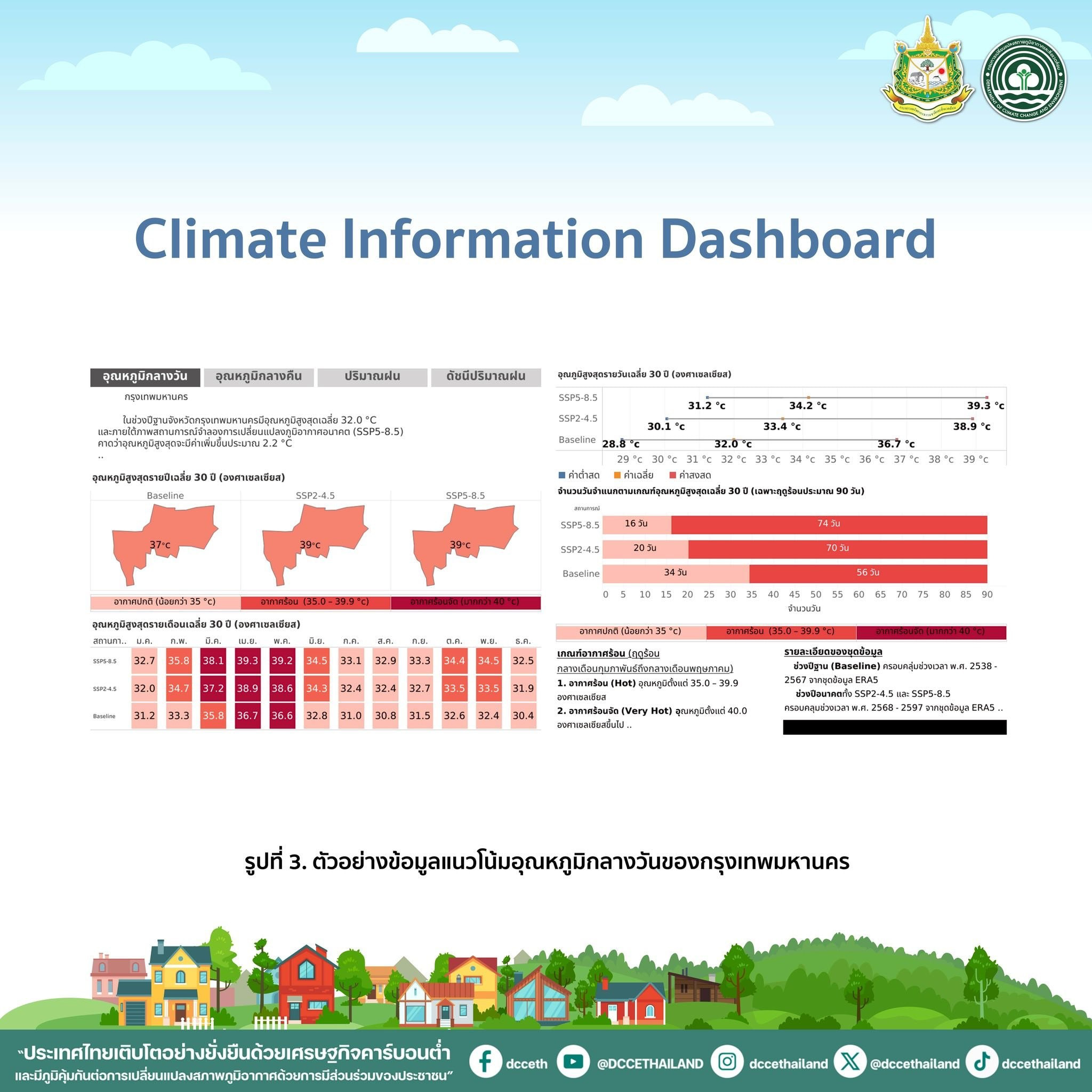 ข้อมูลแนวโน้มภูมิอากาศของจังหวัด พัฒนาขึ้นเพื่อให้ประชาชนและหน่วยงานในพื้นที่ทราบถึงแนวโน้มของภูมิอากาศในช่วง 30 ปีข้างหน้า ได้แก่ อุณหภูมิกลางวัน (Tmax) อุณหภูมิกลางคืน (Tmin) ปริมาณฝน และดัชนีปริมาณฝน (SPI) จากรูปที่ 3 แสดงตัวอย่างข้อมูลแนวโน้มอุณหภูมิกลางวันของกรุงเทพมหานคร พบว่า อุณหภูมิสูงสุดรายวันเฉลี่ย 30 ปีข้างหน้า จะเพิ่มขึ้น จาก 36.7 องศาเซลเซียส เป็น 38.9-39.3 องศาเซลเซียส จำนวนวันที่มีอากาศร้อน จะเพิ่มขึ้นจาก 56 วัน เป็น 70-74 วัน ดังนั้น กรุงเทพมหานคร ควรกำหนดมาตรการเพื่อรับมือกับแนวโน้มของอุณหภูมิที่เพิ่มขึ้น เช่น การเตือนภัยอากาศร้อน การดูแลสุขภาพกลุ่มเปราะบางและผู้ทำงานกลางแจ้งในช่วงฤดูร้อน การเพิ่มห้องหลบร้อน (Cooling Center) การวางผังเมืองโดยคำนึงถึงทิศทางของลม การส่งเสริมการใช้สีทาอาคารเพื่อลดความร้อน เป็นต้น (รูปที่ 3 ตัวอย่างข้อมูลแนวโน้มอุณหภูมิกลางวันของกรุงเทพมหานคร)