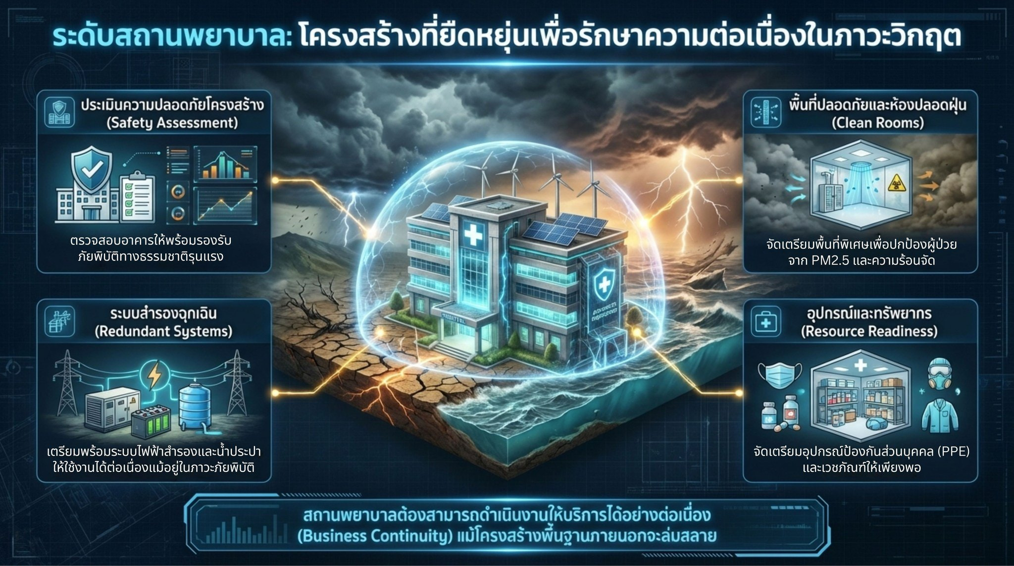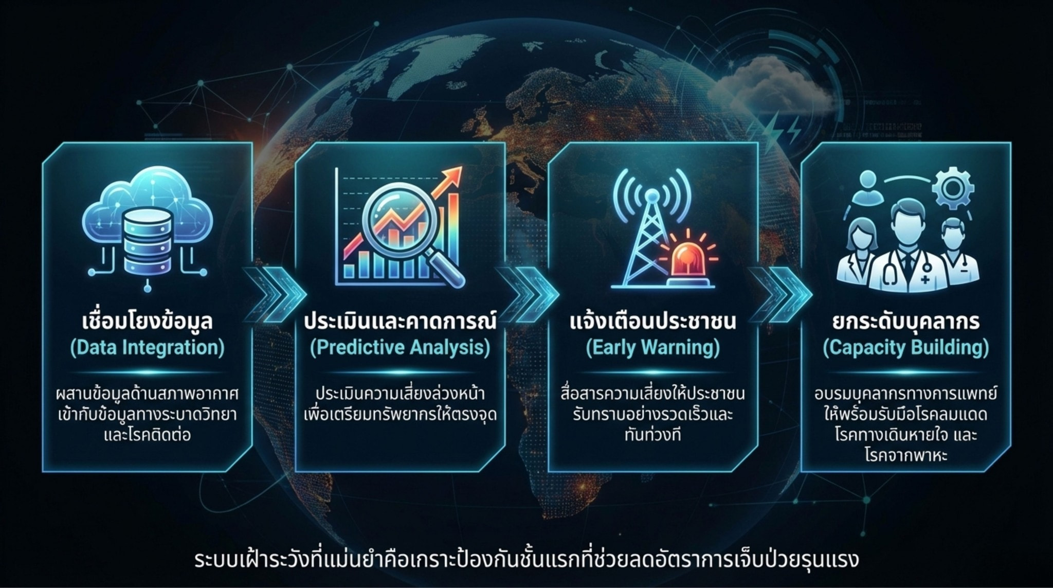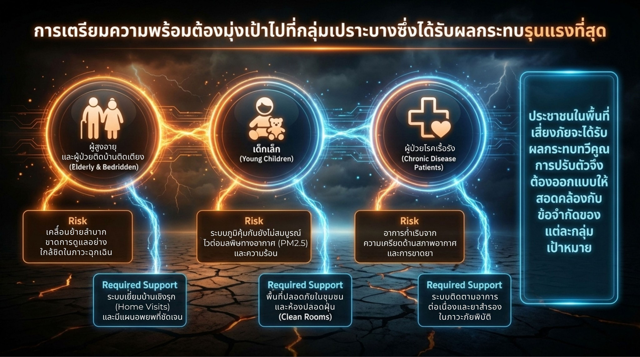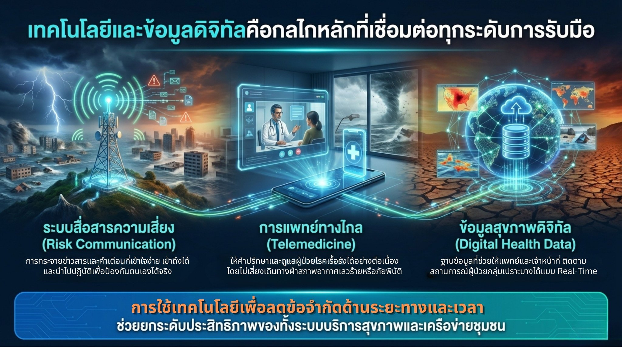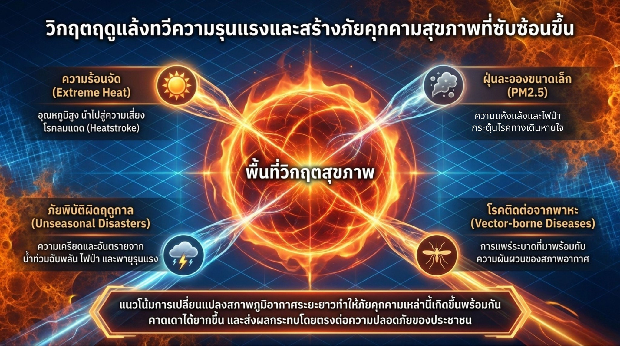 ประเทศไทยกำลังก้าวเข้าสู่ช่วงฤดูแล้งซึ่งมักมาพร้อมกับสภาพอากาศที่ร้อนจัด ความแห้งแล้ง และความผันผวนของสภาพภูมิอากาศที่รุนแรงขึ้นจากแนวโน้มการเปลี่ยนแปลงสภาพภูมิอากาศในระยะยาว สถานการณ์ดังกล่าวไม่เพียงส่งผลกระทบต่อทรัพยากรธรรมชาติและระบบเศรษฐกิจเท่านั้น แต่ยังส่งผลโดยตรงต่อสุขภาพของประชาชน โดยเฉพาะความเสี่ยงจากคลื่นความร้อน ฝุ่นละอองขนาดเล็ก PM2.5 โรคติดต่อที่เกิดจากพาหะ รวมถึงความเครียดจากภัยพิบัติทางธรรมชาติ เช่น น้ำท่วมฉับพลัน ไฟป่า หรือพายุรุนแรงที่เกิดขึ้นผิดฤดูกาล กลุ่มประชากรที่มีความเปราะบาง เช่น ผู้สูงอายุ เด็กเล็ก ผู้ป่วยโรคเรื้อรัง และประชาชนในพื้นที่เสี่ยงภัย จึงมีแนวโน้มได้รับผลกระทบมากกว่ากลุ่มอื่น การเตรียมความพร้อมและการปรับตัวของระบบสุขภาพและสังคมจึงเป็นกลไกสำคัญในการลดความเสี่ยงและเสริมสร้างความปลอดภัยให้กับประชาชนในสภาวะภูมิอากาศที่เปลี่ยนแปลงอย่างรวดเร็ว