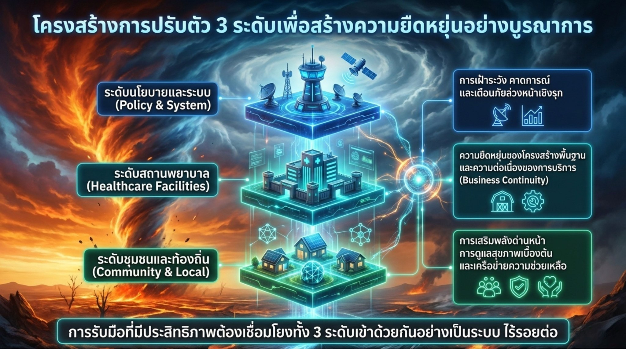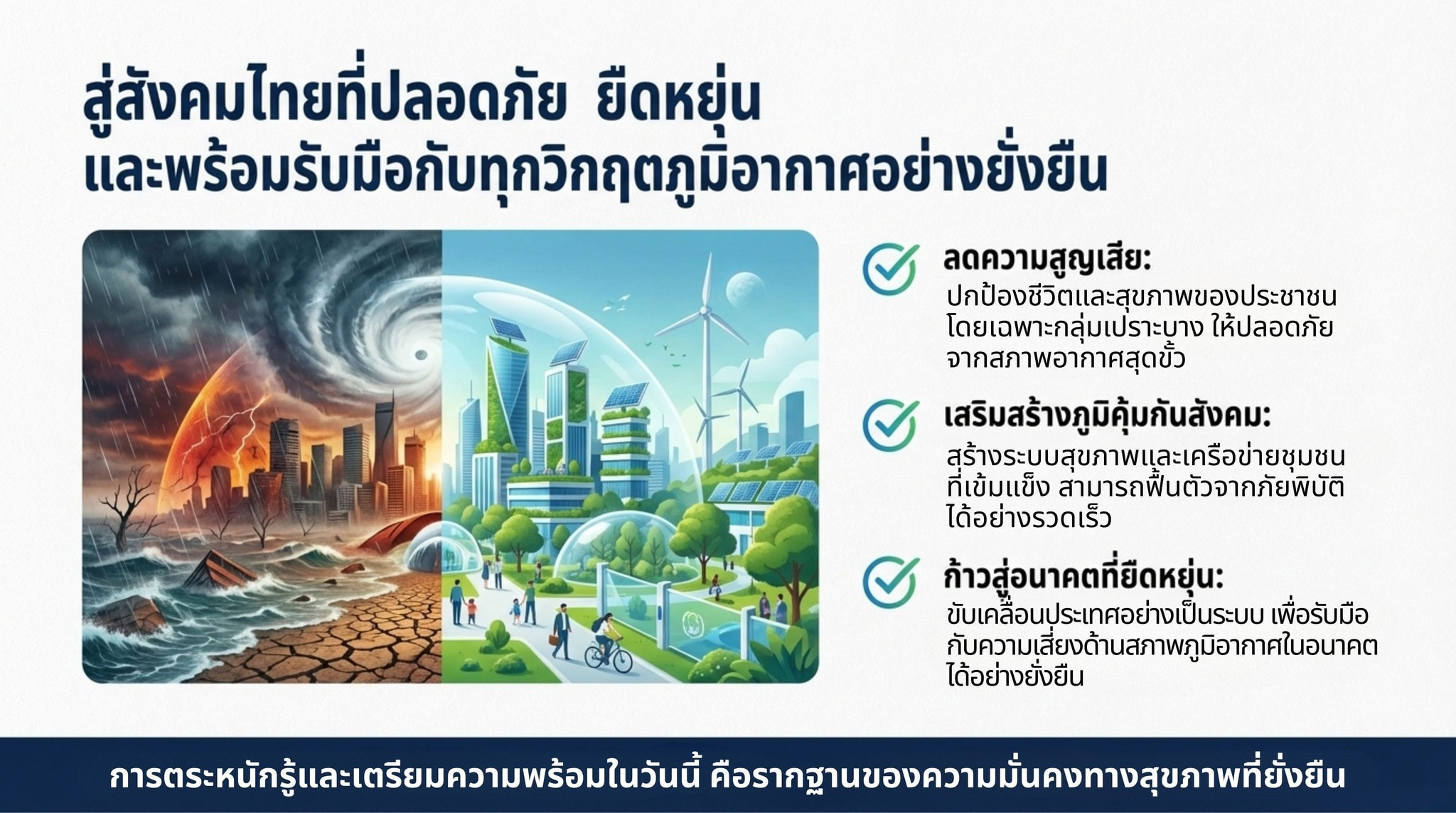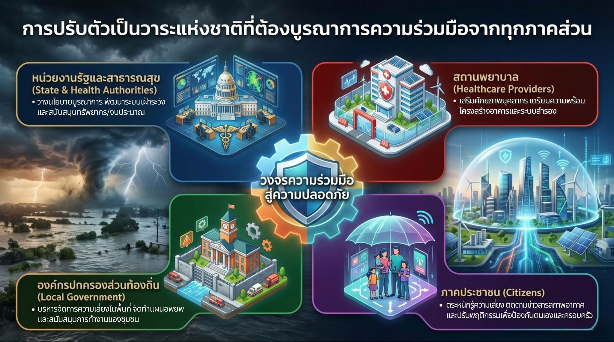 ในท้ายที่สุด การปรับตัวต่อการเปลี่ยนแปลงสภาพภูมิอากาศด้านสุขภาพมิใช่เป็นเพียงภารกิจของหน่วยงานสาธารณสุขเท่านั้น แต่ต้องอาศัยความร่วมมือจากทุกภาคส่วน ทั้งหน่วยงานรัฐ องค์กรปกครองส่วนท้องถิ่น ภาคประชาสังคม และประชาชน การตระหนักรู้ถึงความเสี่ยงด้านสุขภาพจากสภาพอากาศที่เปลี่ยนแปลง และการปรับพฤติกรรมเพื่อดูแลสุขภาพของตนเองและครอบครัว เช่น การติดตามข้อมูลสภาพอากาศ การป้องกันตนเองจากความร้อนและมลพิษทางอากาศ รวมถึงการเตรียมความพร้อมรับสถานการณ์ฉุกเฉิน จะช่วยเสริมสร้างภูมิคุ้มกันให้กับสังคมไทยโดยรวม เมื่อทุกภาคส่วนร่วมกันขับเคลื่อนการปรับตัวอย่างเป็นระบบ ประเทศไทยจะสามารถลดผลกระทบด้านสุขภาพจากการเปลี่ยนแปลงสภาพภูมิอากาศ และก้าวสู่สังคมที่มีความปลอดภัยและยืดหยุ่นต่อความเสี่ยงในอนาคตได้อย่างยั่งยืน
