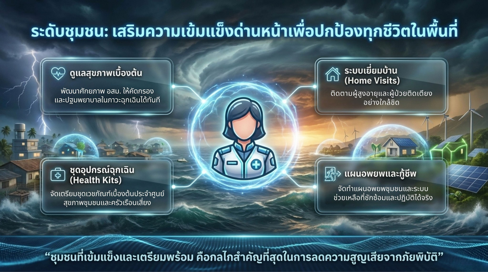 ในระดับพื้นที่ การสร้างความเข้มแข็งของชุมชนถือเป็นองค์ประกอบสำคัญของการปรับตัว โดยการพัฒนาศักยภาพอาสาสมัครสาธารณสุขประจำหมู่บ้าน (อสม.) และเครือข่ายชุมชนในการดูแลสุขภาพเบื้องต้น การจัดเตรียมชุดอุปกรณ์ด้านสุขภาพสำหรับสถานการณ์ฉุกเฉิน และการพัฒนาศูนย์สุขภาพชุมชนให้สามารถรองรับสถานการณ์ภัยพิบัติได้ นอกจากนี้ การให้ความสำคัญกับการดูแลกลุ่มเปราะบาง เช่น การติดตามผู้สูงอายุหรือผู้ป่วยติดบ้านติดเตียงผ่านระบบเยี่ยมบ้าน รวมถึงการจัดทำแผนอพยพและระบบช่วยเหลือผู้ป่วยในสถานการณ์ฉุกเฉิน เป็นอีกแนวทางหนึ่งที่ช่วยลดความสูญเสียที่อาจเกิดขึ้นได้ การดำเนินการเหล่านี้ควบคู่กับการสื่อสารความเสี่ยงด้านสุขภาพให้ประชาชนเข้าใจง่าย เข้าถึงได้ และสามารถนำไปปฏิบัติได้จริง จะช่วยให้ประชาชนสามารถเตรียมตัวรับมือกับสถานการณ์สภาพอากาศที่เปลี่ยนแปลงได้อย่างเหมาะสม