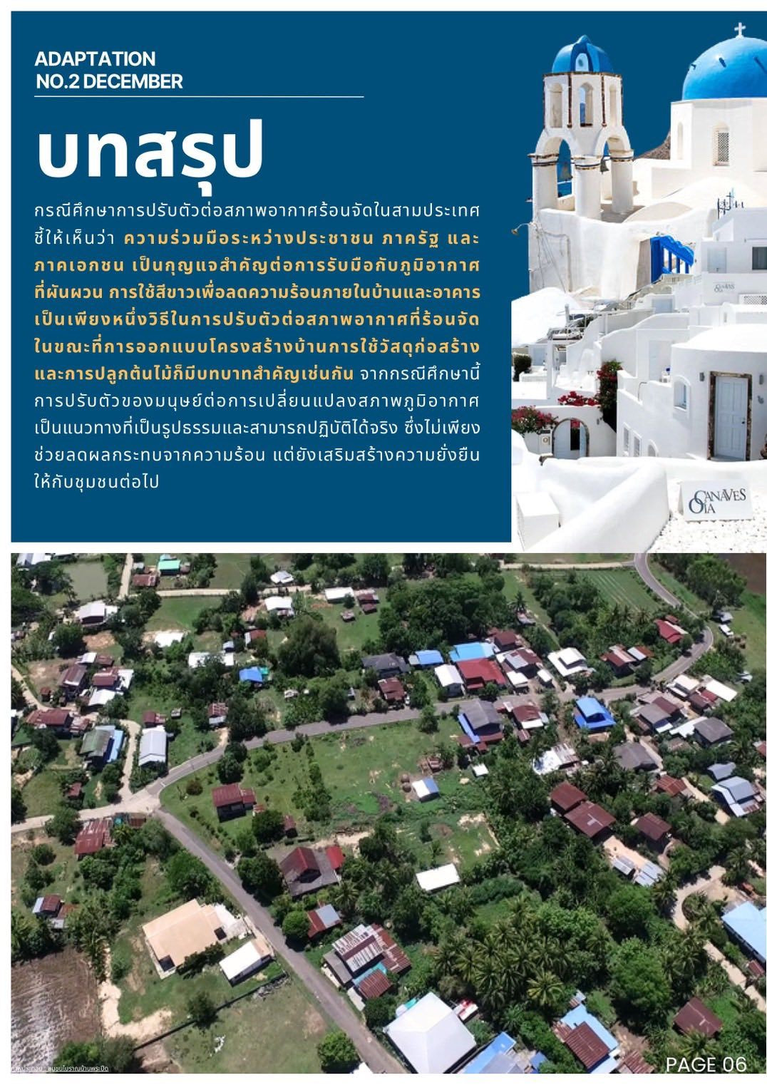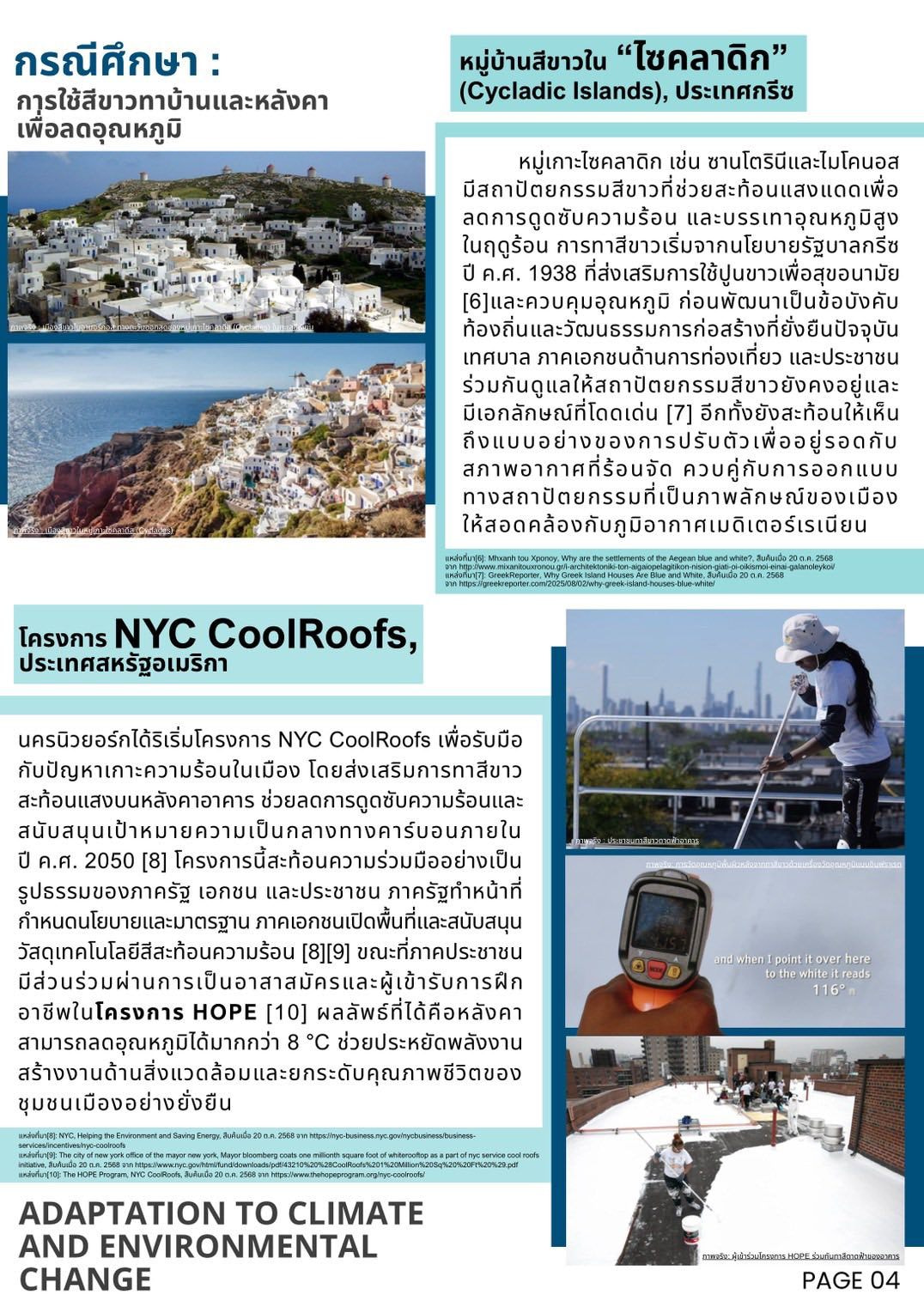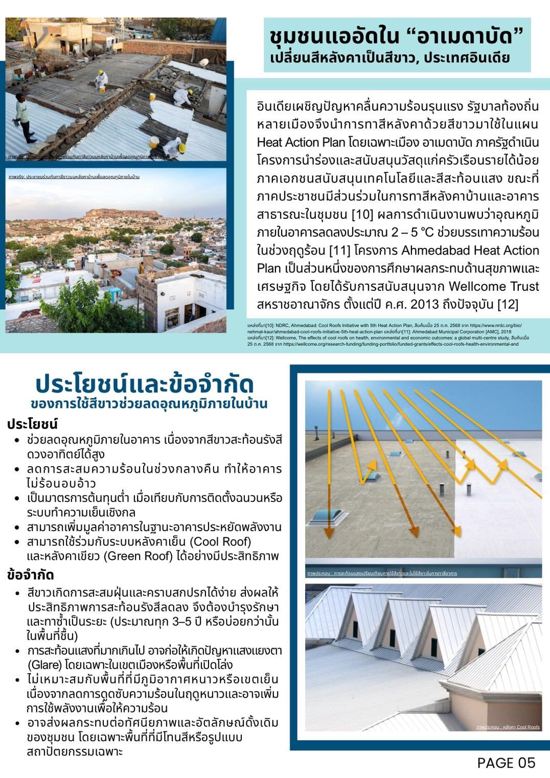 • ยกตัวอย่างกรณีศึกษาจากหมู่บ้านสีขาวใน “ไซคลาดิก” ประเทศกรีซ และเมือง “อาเมดาบัด” ที่มีการปรับเปลี่ยนหลังคาเป็นสีขาว