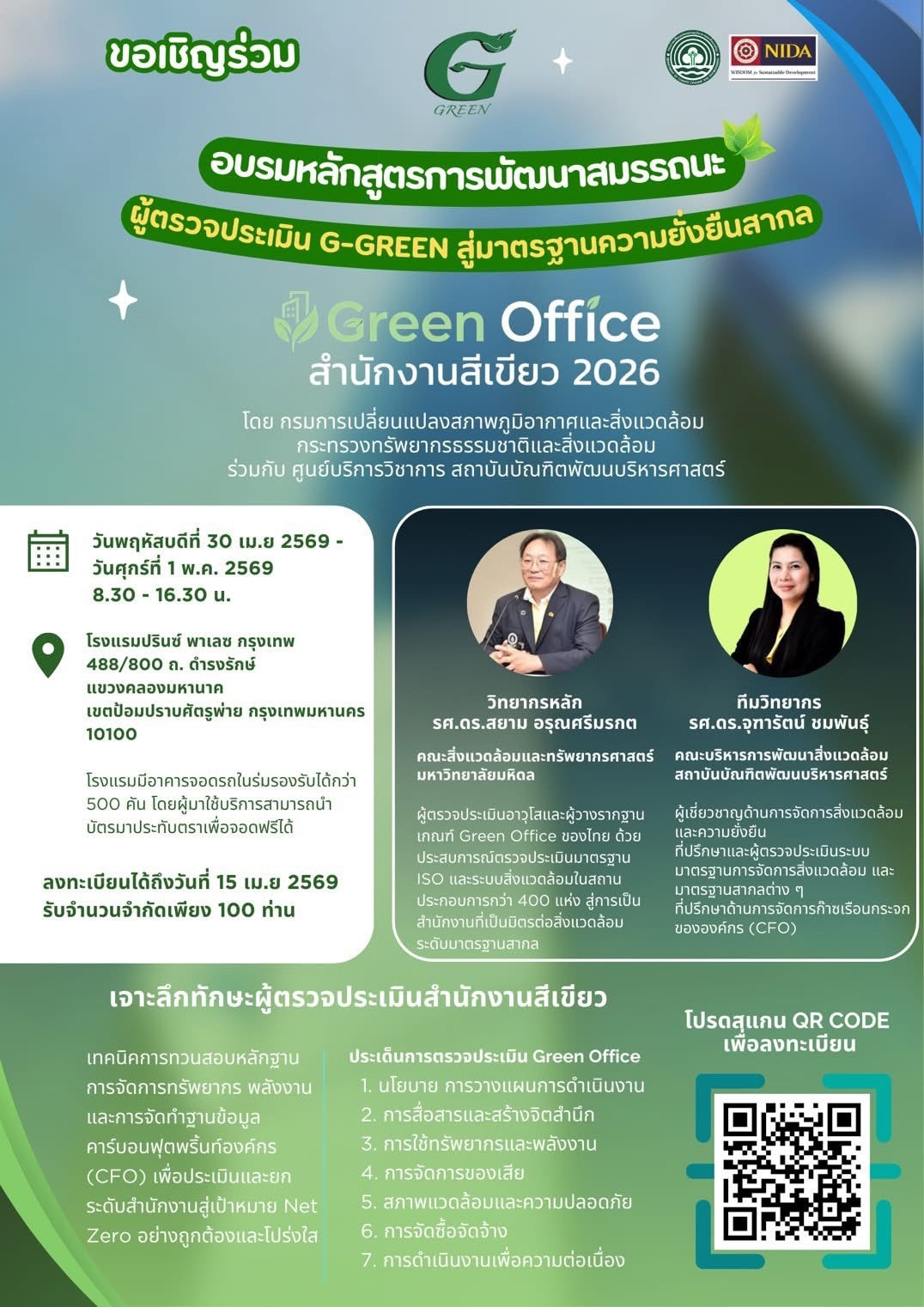 กรมลดโลกร้อน ร่วมกับ NIDA ขอเชิญร่วมอบรมหลักสูตรการพัฒนาสมรรถนะผู้ตรวจประเมิน G-GREEN สู่มาตรฐานความยั่งยืนสากล Green Office สำนักงานสีเขียว 2026