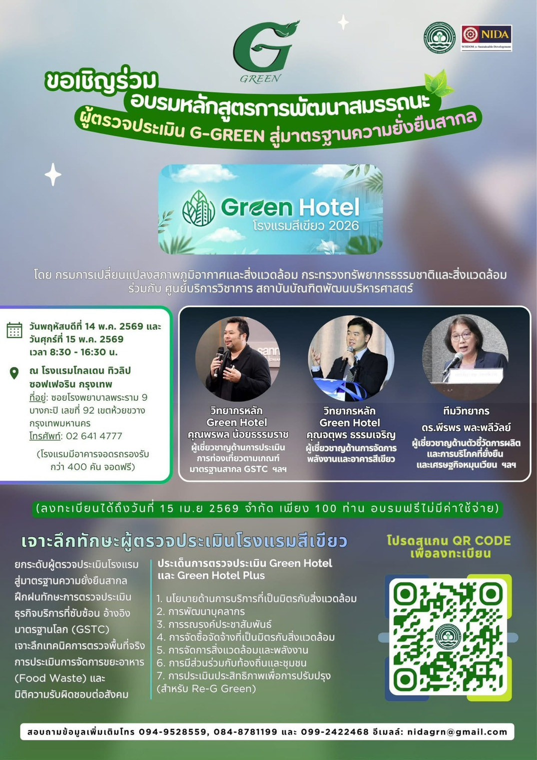 กรมลดโลกร้อน ร่วมกับ NIDA ขอเชิญร่วมอบรมหลักสูตรการพัฒนาสมรรถนะผู้ตรวจประเมิน G-GREEN สู่มาตรฐานความยั่งยืนสากล Green Hotel โรงแรมที่เป็นมิตรกับสิ่งแวดล้อม 2026