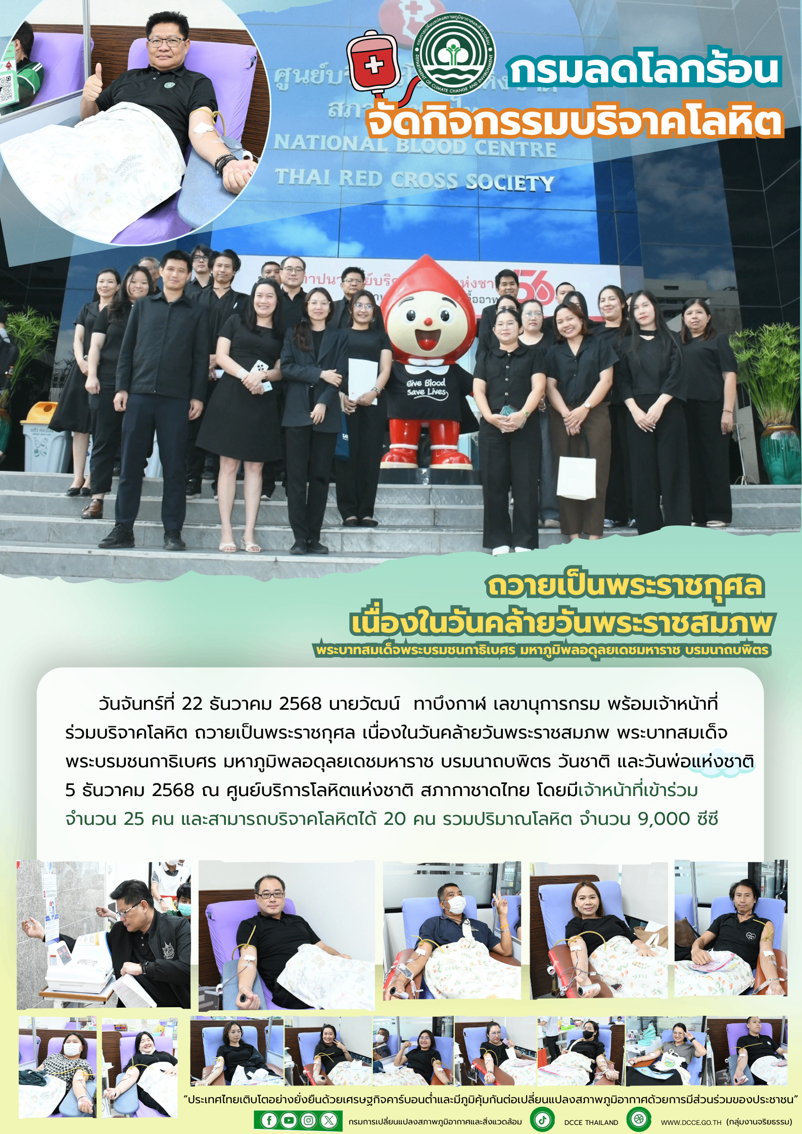 วันจันทร์ที่ 22 ธันวาคม 2568 นายวัฒน์ ทาบึงกาฬ เลขานุการกรม พร้อมเจ้าหน้าที่ร่วมบริจาคโลหิต ถวายเป็นพระราชกุศล เนื่องในวันคล้ายวันพระราชสมภพ พระบาทสมเด็จพระบรมชนการิเบศร มหาภูมิพลอดุลยเดชมหาราช บรมนาถบพิตร วันชาติ และวันพ่อแห่งชาติ 5 ธันวาคม 2568 ณ ศูนย์บริการโลหิตแห่งชาติ สภากาชาดไทย โดยมีเจ้าหน้าที่เข้าร่วมจำนวน 25 คน และสามารถบริจาคโลหิตได้ 20 คน รวมปริมาณโลหิต จำนวน 9,000 ซีซี
