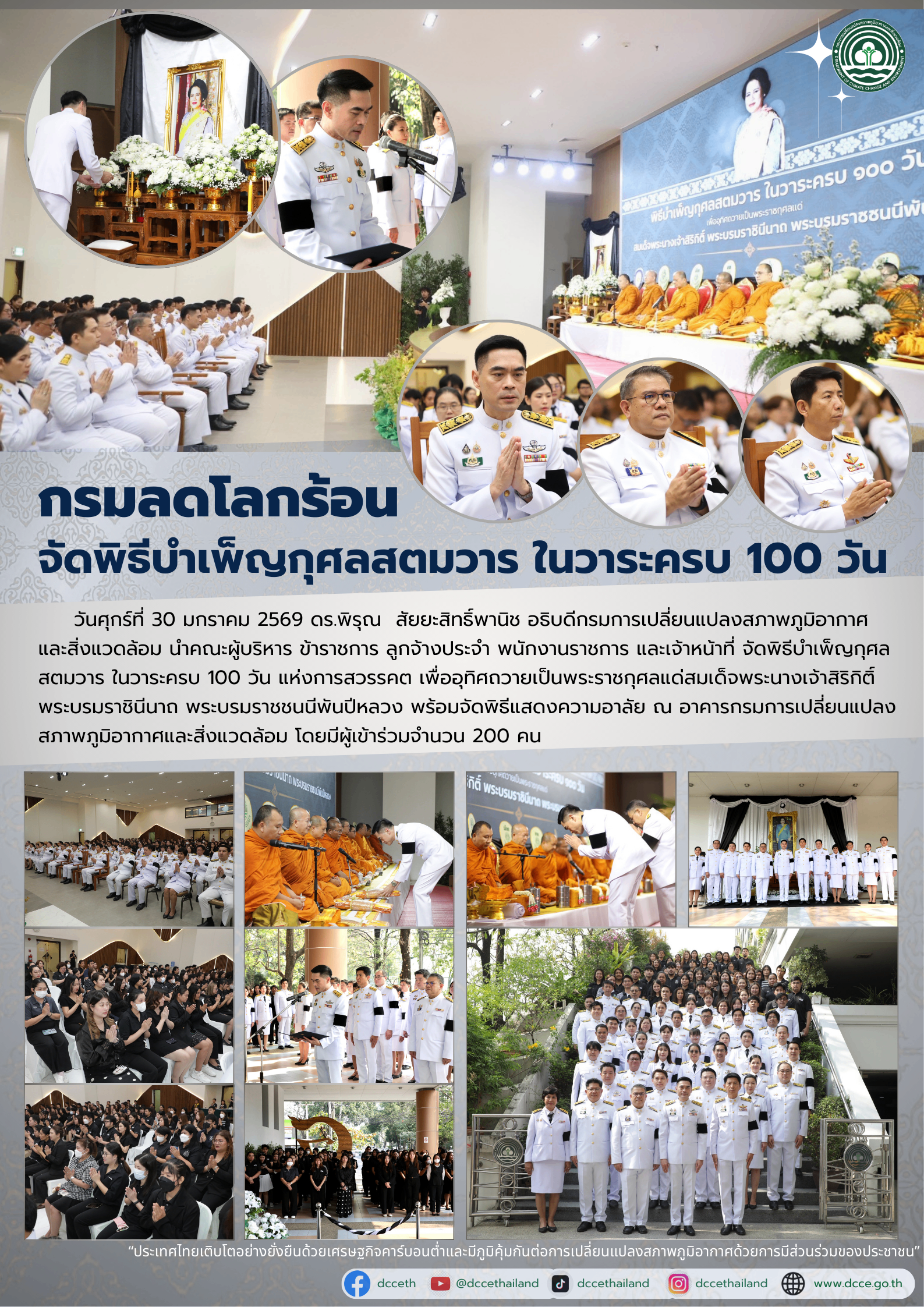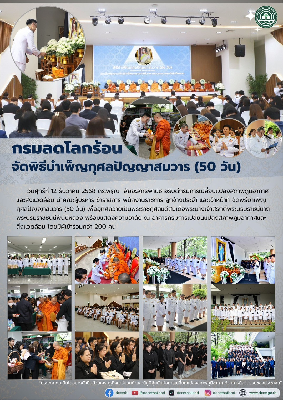 วันศุกร์ที่ 12 ธันวาคม 2568 ดร.พิรุณ สัยยะสิทธิ์พานิช อธิบดีกรมการเปลี่ยนแปลงสภาพภูมิอากาศและสิ่งแวดล้อม นำคณะผู้บริหาร ข้าราชการ พนักงานราชการ ลูกจ้างประจำ และเจ้าหน้าที่ จัดพิธีบำเพ็ญ กุศลปัญญาสมวาร (50 วัน) เพื่ออุทิศถวายเป็นพระราชกุศลแด่สมเด็จพระนางเจ้าสิริกิติ์พระบรมราชินีนาดพระบรมราชชนนีพันปีหลวง พร้อมแสดงความอาลัย ณ อาคารกรมการเปลี่ยนแปลงสภาพภูมิอากาศและ สิ่งแวดล้อม โดยมีผู้เข้าร่วมกว่า 200 คน