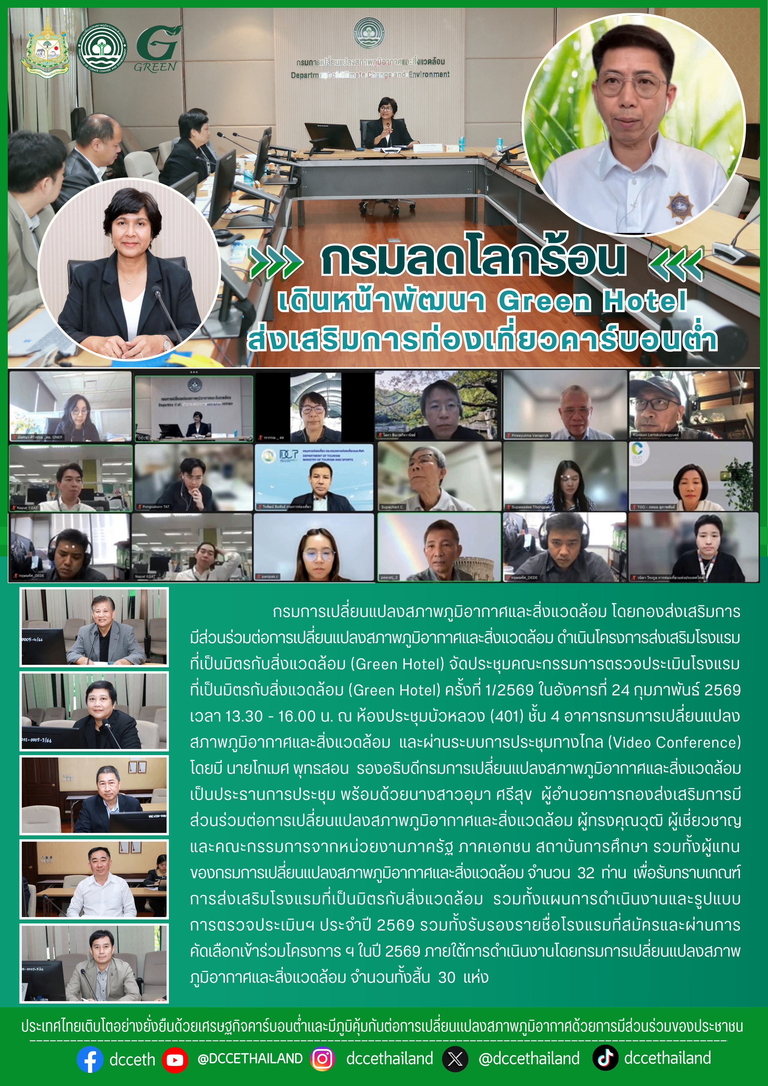 วันที่ 13 กุมภาพันธ์ 2569 เวลา 11:00 น.กองส่งเสริมการมีส่วนร่วมต่อการเปลี่ยนแปลงสภาพภูมิอากาศและสิ่งแวดล้อม โดย กลุ่มส่งเสริมการผลิตและการบริโภคที่ยั่งยืน จัดการประชุมออนไลน์ผ่านระบบ Microsoft Team หารือแนวทางความร่วมมือการประชาสัมพันธ์และเชื่อมโยงข้อมูลโรงแรมที่เป็นมิตรกับสิ่งแวดล้อม Green hotel และ Green Hotel Plus ผ่าน OTA gother สัญชาติไทย พัฒนาทางเลือกกลุ่มลูกค้าที่พักต้องการที่พักที่ใส่ใจสิ่งแวดล้อม และที่พักที่ให้ความสำคัญในประเด็นการพัฒนาที่ยั่งยืน ที่ได้รับการรับรองโดยหน่วยงานที่มีความเชื่อถือ และเทียบเท่ามาตรฐานสากล