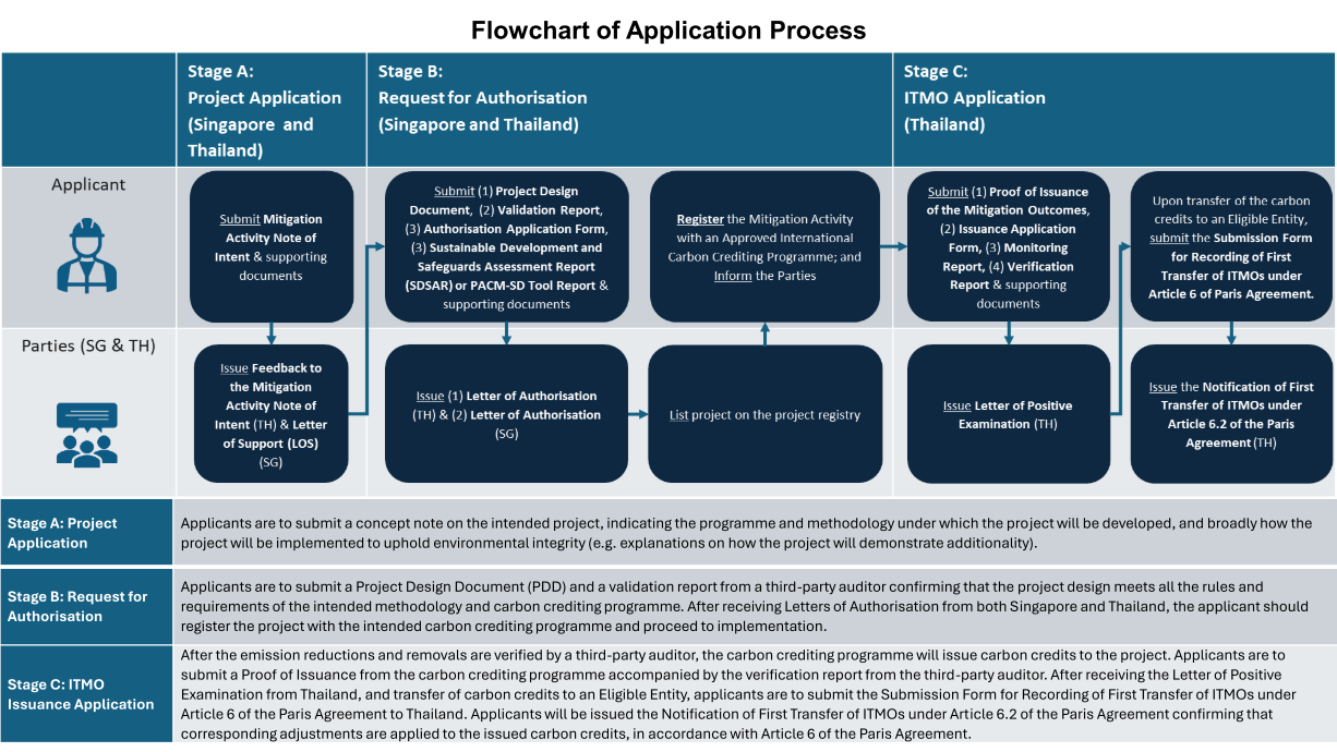 Project participants and interested entities seeking authorisation for the international transfer of mitigation outcomes (carbon credits) under the Implementation Agreement pursuant to Article 6 of the Paris Agreement between the Government of the Kingdom of Thailand and the Government of the Republic of Singapore may proceed in accordance with the process outlined below.