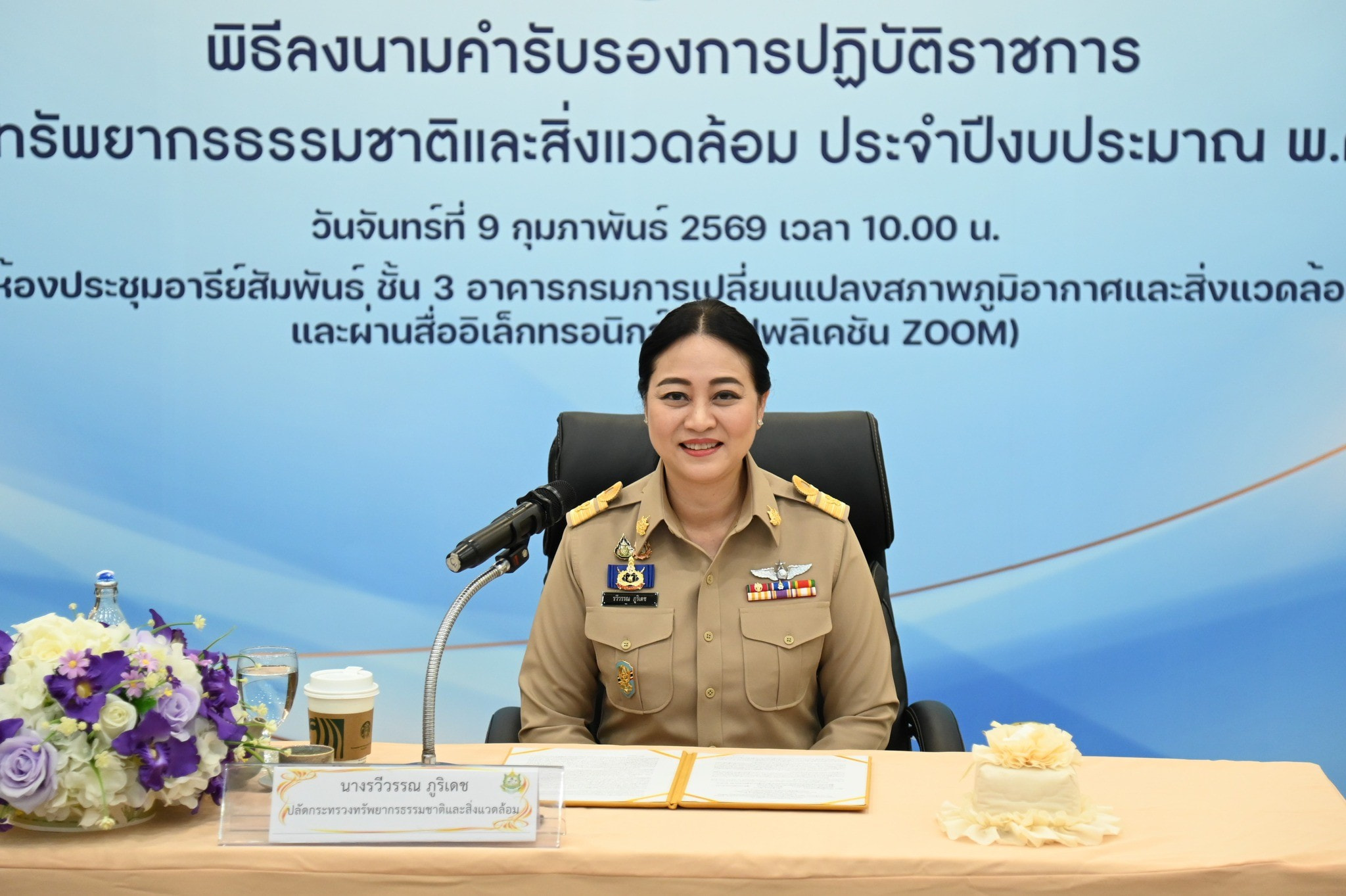วันนี้ (9 กุมภาพันธ์ 2569) เวลา 10.00 น. ดร.รวีวรรณ ภูริเดช ปลัดกระทรวงทรัพยากรธรรมชาติและสิ่งแวดล้อม เป็นประธานในพิธีลงนามคำรับรองการปฏิบัติราชการ กระทรวงทรัพยากรธรรมชาติและสิ่งแวดล้อม ประจําปีงบประมาณ พ.ศ. 2569 โดยมี ดร.พิรุณ สัยยะสิทธิ์พานิช อธิบดีกรมการเปลี่ยนแปลงสภาพภูมิอากาศและสิ่งแวดล้อม เข้าร่วมพร้อมด้วย คณะผู้บริหาร และหน่วยงานในสังกัด ร่วมลงนามคำรับรองฯ ณ ห้องประชุมอารีย์สัมพันธ์ ชั้น 3 อาคารกรมการเปลี่ยนแปลงสภาพภูมิอากาศและสิ่งแวดล้อมและผ่านระบบ Video Conference
